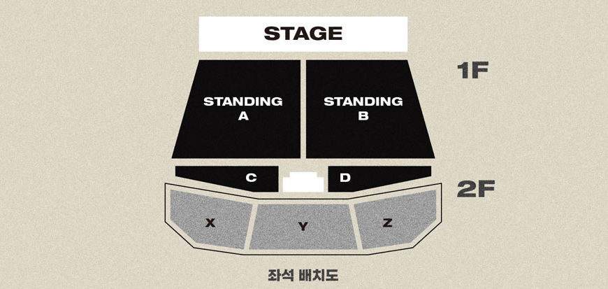 - 본 공연의 좌석은 1층 스탠딩석과 2층 지정석으로 나누어져 있습니다.